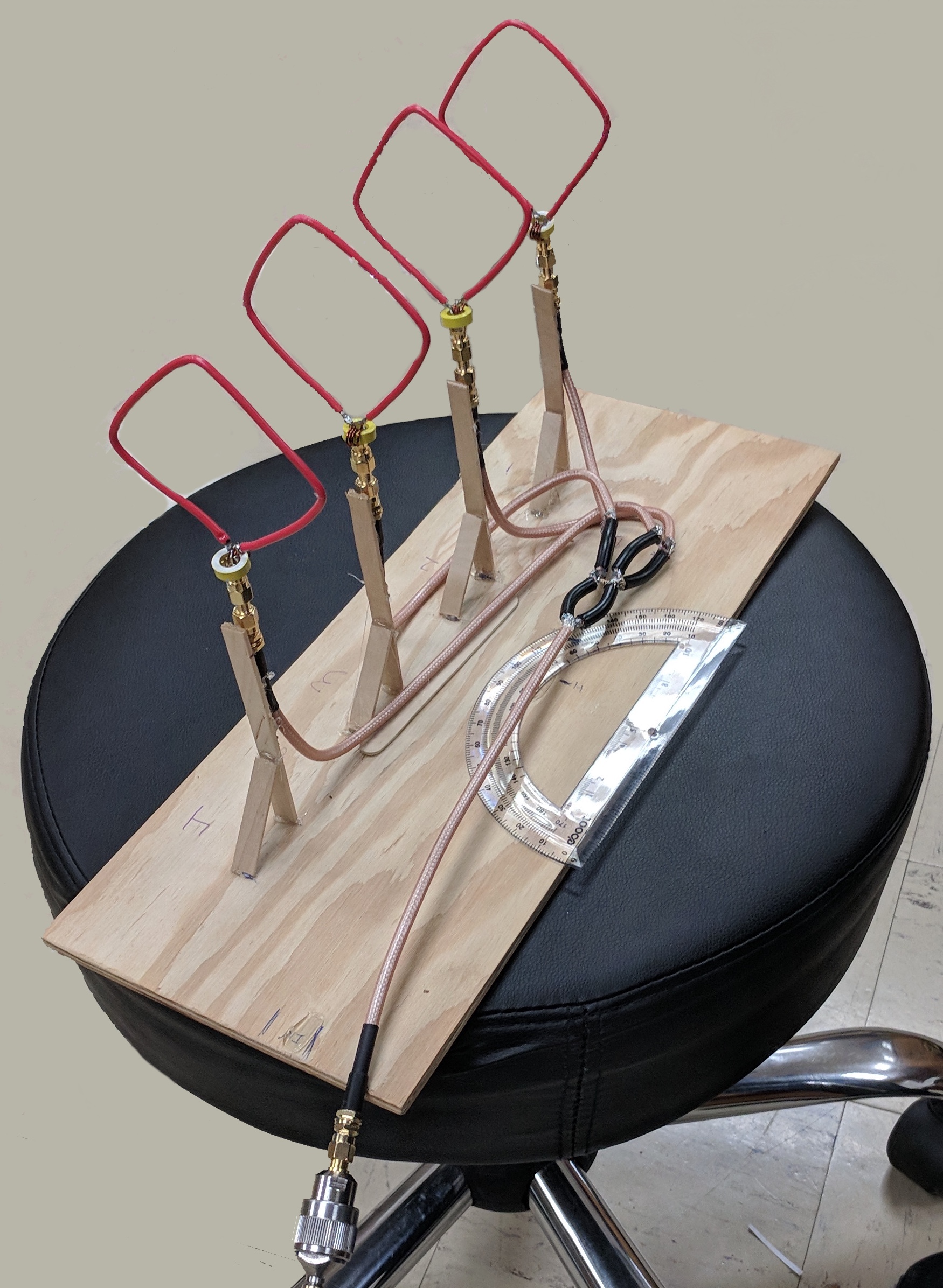 A 1:4 power splitter and a 4x1 antenna array, tuned to work at 1.3 GHz. In version 2(pictured) the antenna-frequency and the splitter-frequency were 0.05 GHz off in opposite directions... V3 would work for sure!