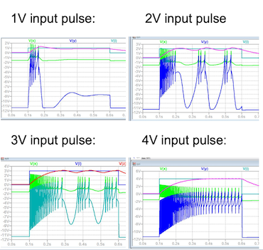 Implementation of Hindmarsh-Rose neuron and Quadratic Integrate and Fire neuron on breadboard including OP amps, and analog multipliers.